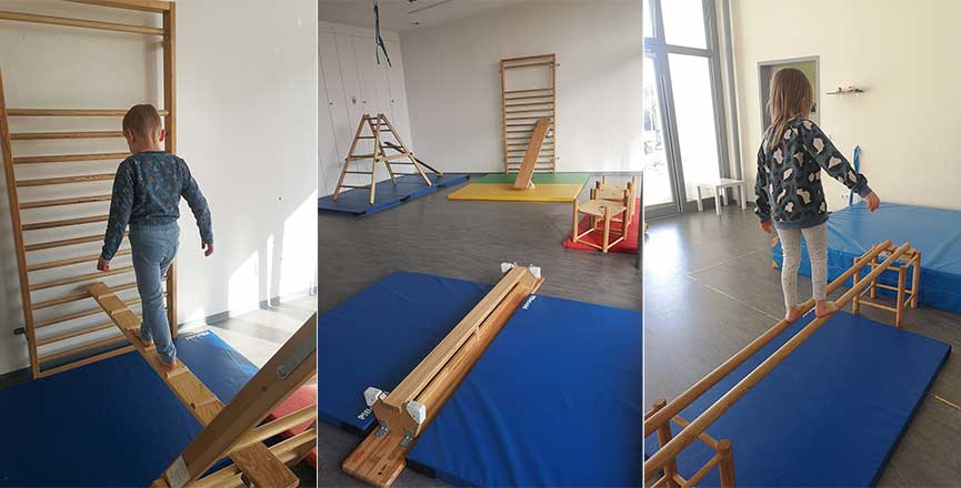 Der Bewegungsraum nimmt im pädagogischen Konzept der Kita einen großen Raum ein. Durch vielfältige Bewegungsangebote möchte die Kita nämlich dem natürlichen Bedürfnis der Kinder nach Aktivität, Wahrnehmung und Körpererfahrung gerecht werden. Über Bewegung lernen Kinder, ihren Körper zu koordinieren, ihren Atem zu steuern und rhythmische Strukturen zu erkennen.
