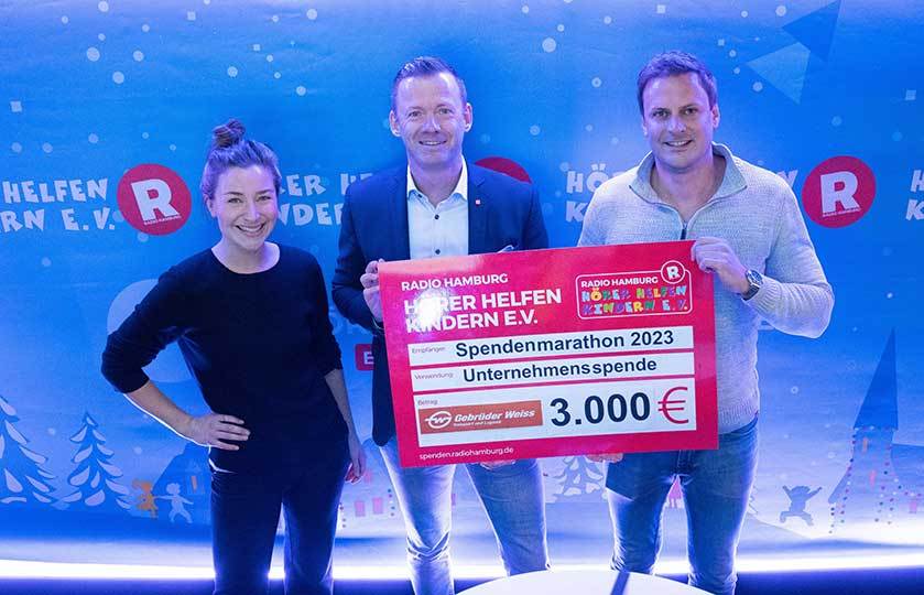 Das Logistikunternehmen Gebrüder Weiss GmbH/ Niederlassung Hamburg in Hammerbrook spendet 3.000 Euro (Spende an HHK statt Präsente an die Kundschaft). Auf dem Bild sind Patrick Krick (Mitte, HR Manager) und Marco Koch (Leitung der Niederlassung HH, rechts).