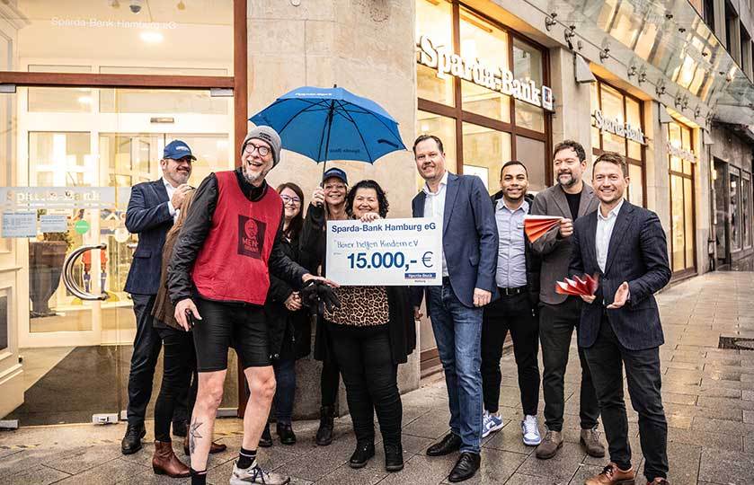 Von der Sparda Bank Hamburg kommt eine unglaublich großzügige Großspende in Höhe von 15.000 Euro! Dieser Betrag ist von den Gewinnsparern und Gewinnsparerinnen im aktuellen Jahr als sogenannter Zweckertrag zusammengekommen. Der Filialleiter der Sparda Bank am Ballindamm, Andreas Broocks, hat die Spende bei „Ment rennt“ reingemeldet und sich damit bei allen Kunden bedankt. Er stand zusammen mit zahlreichen Kollegen vor der Filiale und hat John angefeuert.