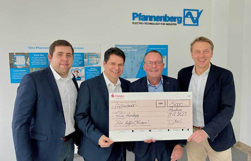 Auch 2023 haben die Mitarbeiter der Pfannenberg Gruppe wieder fleißig mitgespendet. Danke dafür! Foto von links nach rechts (Tobias Merl, CEO | Jan Möbius, COO & Managing Director Pfannenberg GmbH | Mark Keuneke, Director Global Human Resources | Jan Lautenschläger, Managing Director Pfannenberg Europe GmbH)