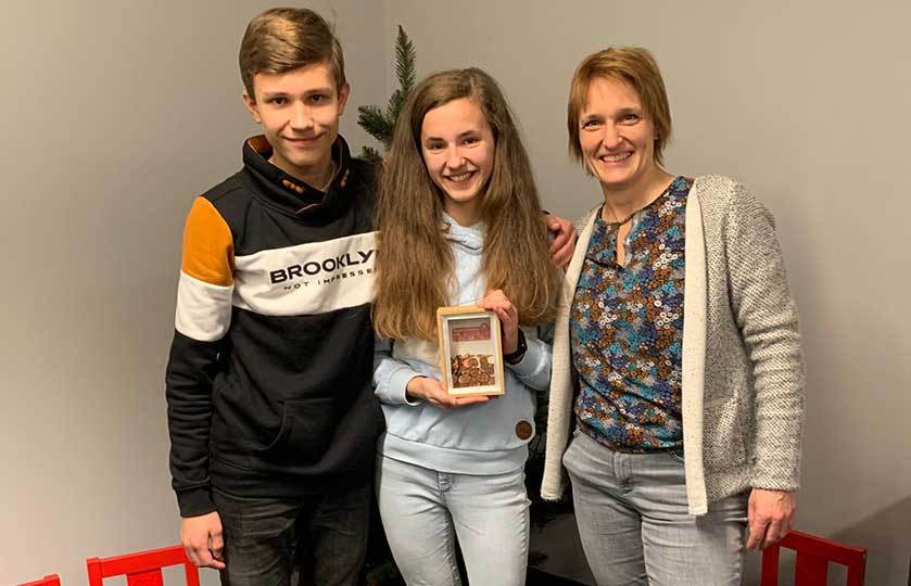 Marisa, Leon und Mutter Melanie Scheidweiler & Hund Pablo. Tochter Marisa hat 38,21 von ihrem Taschengeld gespendet und Mama Melanie 27,80 Euro. Die 7,80 davon mit einer eigens gebastelten Spendendose und 1ct Glücks-Münzen.