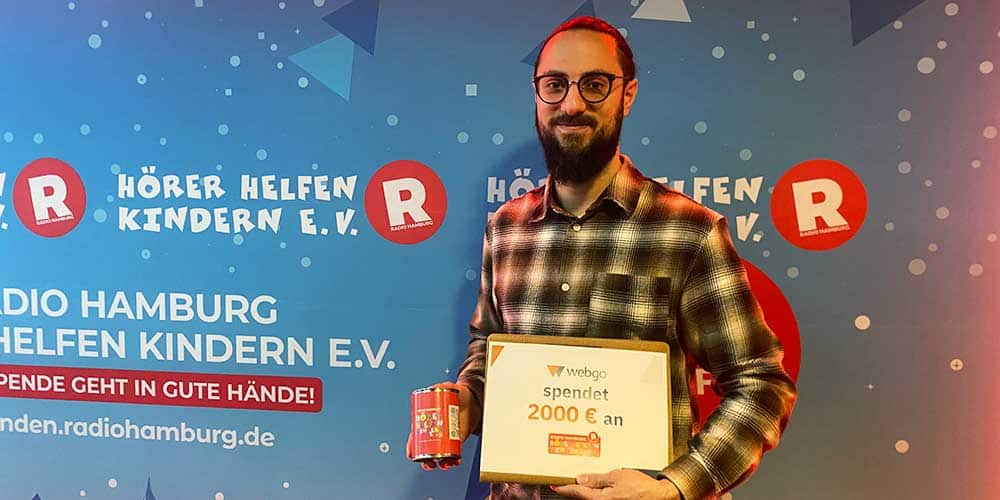 Bei der webgo GmbH in der City-Süd wurde anlässlich des 20-jährigen Firmenjubiläums eine Tombola veranstaltet, deren Erlös an Hörer helfen Kindern geht. Weiterhin wurde bei einem gemeinsamen Würstchengrillen gesammelt und das ganze Jahr über eine Dose aufgestellt, in die die Mitarbeitenden ab und zu Geld steckten. Die daraus entstandene Summe hat die Firma auf 2.000 Euro aufgestockt. Die Spende überbringt Marcel Al-Sultan-El-Ghori (Head of Marketing).